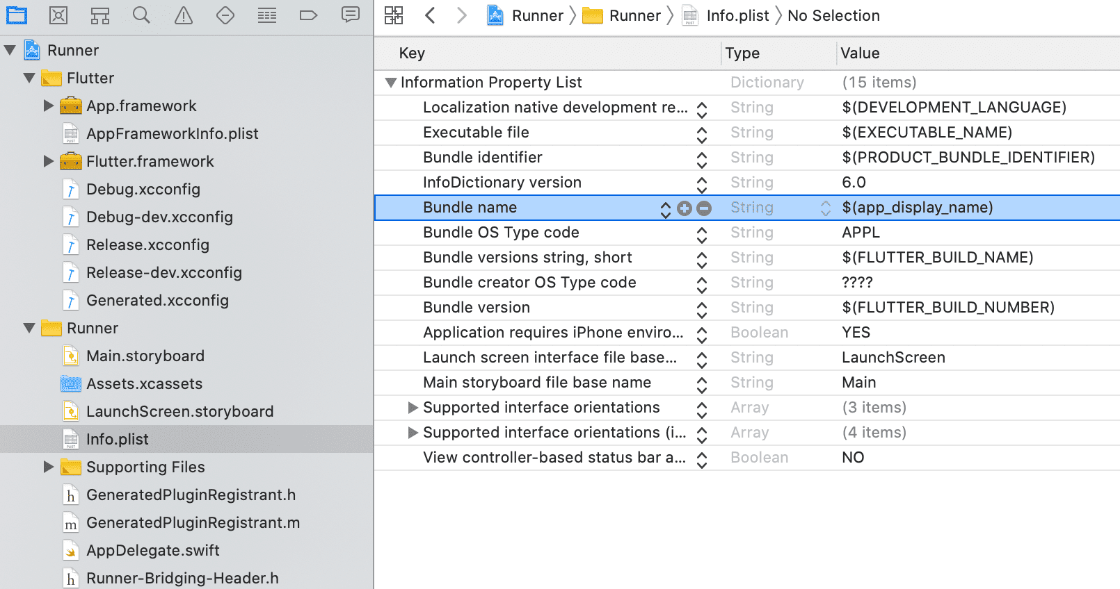 We start by looking at build configurations in XCode. Build configurations define properties which we can reference later. Open the ios module in XCode (open ios/Runner.xcworkspace) and take a look at the contents of the Runner/Flutter folder. There should be already three configurations.